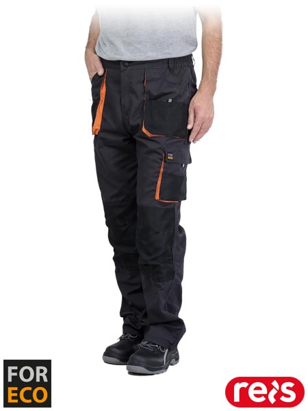 Spodnie ochronne do pasa, męskie.- materiał główny: tkanina 80% poliester, 20% bawełna o gramaturze 260 g/m2- wstawki: tkanina 100% poliester Oxford 600D o gramaturze 200 g/m2- zapinane na guzik oraz zamek błyskawiczny- dwie podwójne kieszenie boczne z przegródkami oraz dwie tylne zapinane na rzep- dwie podwójne kieszenie na nogawkach, w tym jedna podłużna- kieszenie na wkładki nakolannikowe wkładane od dołu, zapinane na rzep- gumka w pasie w bocznych partiach umożliwiająca lepsze dopasowanie- dodatkowa szlufka na akcesoria zapinana na rzep- końcówka do przypięcia kluczy- uchwyt na młotek na lewej nogawce- odblaskowe elementy zwiększające widoczność- fason: REGULAR- testowane na zawartość szkodliwych dla zdrowia substancji zgodnie ze standardami OEKO-TEX® Standard 100