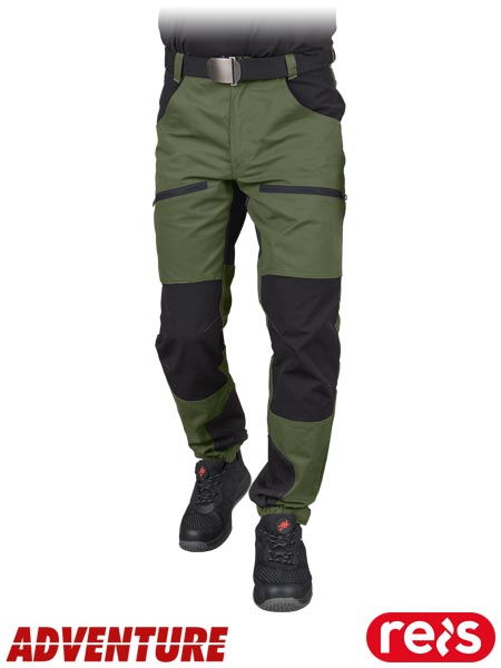 Spodnie ochronne do pasa HOBBER, męskie.- materiał główny: tkanina o splocie canvas 65% poliester, 35% bawełna o gramaturze 260 g/m2- wstawki na kolanach, przy górnych bocznych kieszeniach oraz w tylnej części: 94% poliamid, 6% elastan o gramaturze 270 g/m2- dodatkowe wstawki na dolnej wewnętrznej części nogawek: 100% poliester Oxford 600D o gramaturze 200 g/m2- zapinane na guzik oraz zamek błyskawiczny- dwie boczne kieszenie oraz dwie tylne kieszenie zapinane na suwak z dodatkowymi patkami- kieszenie na nogawkach zapinane na suwak- gumka w pasie w tylnej partii umożliwiająca lepsze dopasowanie- nogawki zakończone ściągaczem z dodatkowym zapięciem na rzep umożliwiającym regulację ich szerokości- idealne zarówno do pracy, jak i codziennego użytku