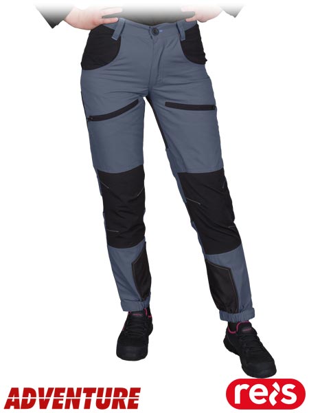 Spodnie ochronne do pasa HOBBER, damskie.- materiał główny: tkanina o splocie canvas 65% poliester, 35% bawełna o gramaturze 260 g/m2- wstawki na kolanach, przy górnych bocznych kieszeniach oraz w tylnej części: 94% poliamid, 6% elastan o gramaturze 270 g/m2- dodatkowe wstawki na dolnej wewnętrznej części nogawek: 100% poliester Oxford 600D o gramaturze 200 g/m2- zapinane na guzik oraz zamek błyskawiczny- dwie boczne kieszenie oraz dwie tylne kieszenie zapinane na suwak z dodatkowymi patkami- kieszenie na nogawkach zapinane na suwak- gumka w pasie w tylnej partii umożliwiająca lepsze dopasowanie- nogawki zakończone ściągaczem z dodatkowym zapięciem na rzep umożliwiającym regulację ich szerokości- idealne zarówno do pracy, jak i codziennego użytku