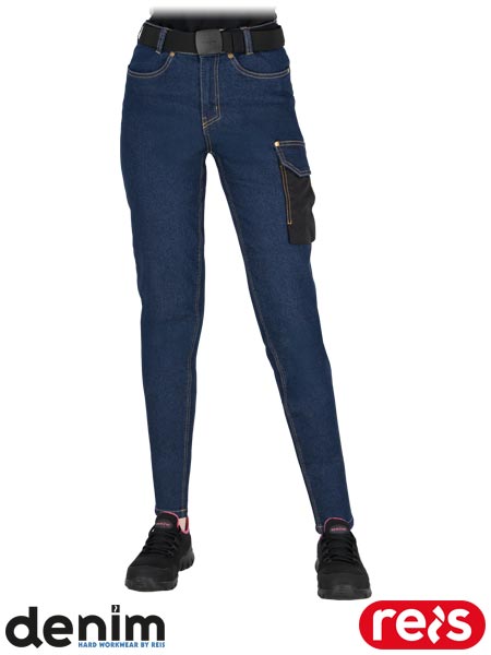 Elastyczne spodnie ochronne do pasa, damskie.- materiał główny: tkanina jeansowa 78% bawełna, 20% poliester, 2% elastan o gramaturze 330 g/m2- wstawki: tkanina Cordura 100% nylon 500D o gramaturze 210-230 g/m2- zapinane na guzik oraz zamek błyskawiczny- dwie kieszenie boczne oraz dwie tylne- podwójna kieszeń na nogawce z przegródkami