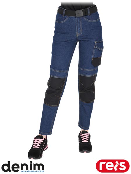 Elastyczne spodnie ochronne do pasa, damskie.- materiał główny: tkanina jeansowa 78% bawełna, 20% poliester, 2% elastan o gramaturze 330 g/m2- wstawki: tkanina Cordura 100% nylon 500D o gramaturze 210-230 g/m2- zapinane na guzik oraz zamek błyskawiczny- dwie kieszenie boczne oraz dwie tylne- podwójna kieszeń na nogawce z przegródkami- kieszenie na wkładki nakolannikowe wkładane od góry- wyprofilowane kolana