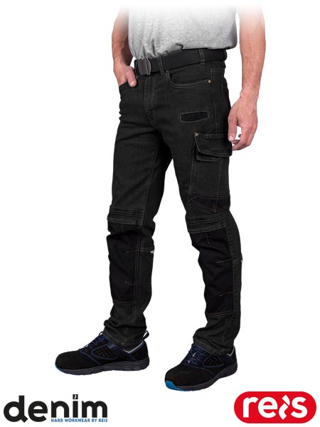 Elastyczne spodnie ochronne do pasa, męskie.- tkanina jeansowa: 78% bawełna, 20% poliester, 2% elastan- gramatura 210-220 g/m2- zapinane na guzik i zamek błyskawiczny- dwie boczne kieszenie- dwie tylne kieszenie, w tym jedna kryta dodatkową patką- kieszenie na nogawkach, w tym na telefon komórkowy- końcówka do przypięcia kluczy- uchwyt na narzędzia- na kolanach kieszenie na wkładki nakolannikowe- odblaskowe elementy pod kolanami- zwiększona wytrzymałość dzięki wstawkom wykonanym z materiału Cordura- zastosowanie elastanu pozwala na lepsze dopasowanie się spodni do sylwetki, jednocześnie nie krępując ruchów