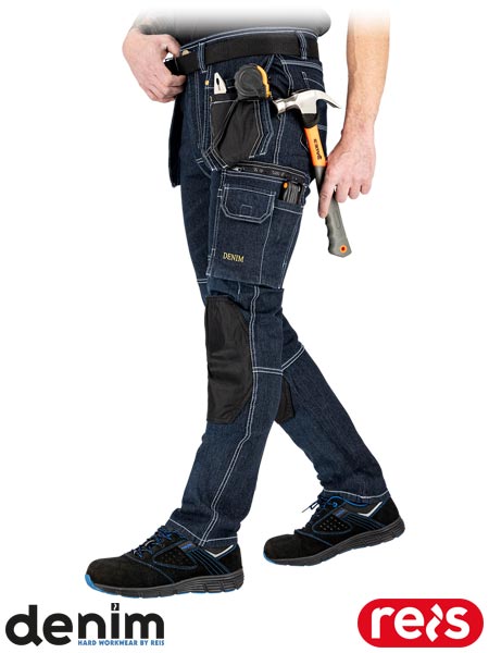 Elastyczne spodnie ochronne do pasa, męskie.- materiał główny: tkanina jeansowa o splocie twill 60% bawełna, 24% poliester, 15% wiskoza, 1% elastan o gramaturze 260-300 g/m2 (kolor WB: 65% bawełna, 33% poliester, 2% elastan)- wstawki: tkanina Cordura 100% poliester powlekana PVC o gramaturze 200 g/m2- zapinane na guzik oraz zamek błyskawiczny- dwie kieszenie boczne, dwie podwójne kieszenie montereskie oraz dwie tylne, w tym jedna zasłonięta patką- kieszenie na nogawkach, w tym jedna potrójna zapinana na suwak oraz rzep oraz jedna podłużna z przegródkami na akcesoria- kieszenie na wkładki nakolannikowe wkładane od dołu z zapięciem na rzep- pętelki umożliwiające doczepienie dodatkowych akcesoriów- uchwyt na młotek na prawej nogawce- przeznaczone dla monterów
