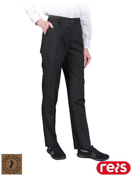 Eleganckie spodnie do pasa w kant, damskie.- tkanina: 100% poliester- gramatura 165 g/m2- zapinane na guzik i zamek błyskawiczny- trzy kieszenie: dwie boczne i jedna tylna zapinana na guzik- testowane na zawartość szkodliwych dla zdrowia substancji zgodnie ze standardami OEKO-TEX® Standard 100- pranie w temperaturze do 40°C
