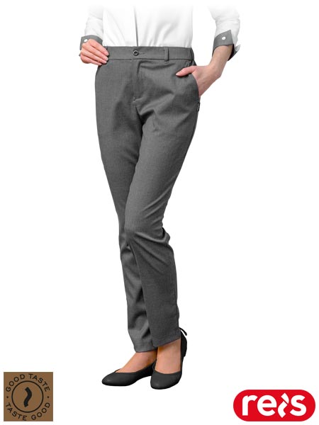 Spodnie do pasa, damskie.- tkanina: 70% poliester, 27% wiskoza, 3% elastan- gramatura 210 g/m2- zapinane na guzik i zamek błyskawiczny- gumka w pasie w tylnej partii zwiększa swobodę ruchów oraz umożliwia lepsze dopasowanie- cztery kieszenie: dwie boczne i dwie tylne- pranie w temperaturze do 30°C