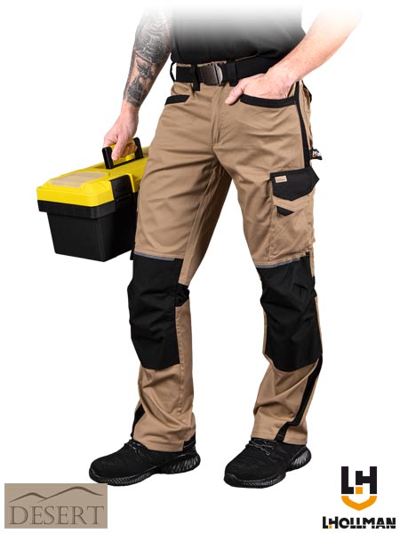 Spodnie ochronne do pasa DESERT.- 97% bawełna, 3% spandex- gramatura 180 g/m2- siateczkowe wstawki wykonane z 80% nylon i 20% spandexu o gramaturze 170 g/m2- dwie boczne kieszenie- dwie tylne kieszenie zapinane na rzep- cztery kieszenie na nogawkach, w tym dwie zapinane na rzep- gumka w pasie w tylnej partii zwiększa swobodę ruchów oraz umożliwia lepsze dopasowanie- na kolanach kieszenie na wkładki nakolannikowe- odblaskowe elementy- zastosowanie siateczki wzdłuż nogawek oraz z tyłu na wysokości kolan zapewnia lepszą wentylację- zwiększona wytrzymałość dzięki wstawkom wykonanym z materiału Cordura- uchwyt na młotek na lewej nogawce- idealne na upalne dni
