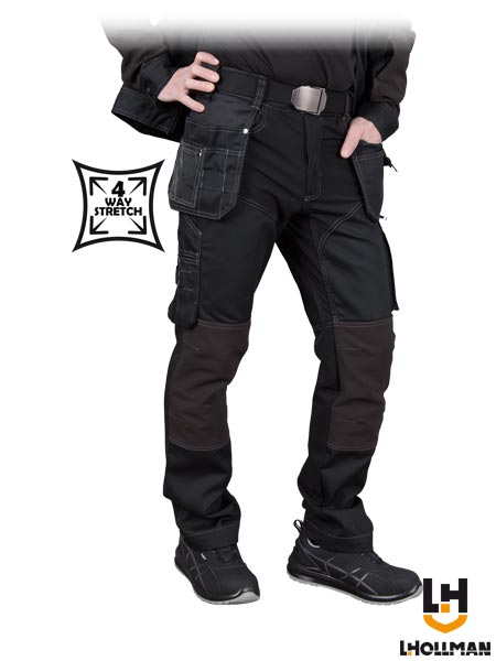 Spodnie ochronne do pasa, męskie.- materiał główny: tkanina o splocie canvas 65% poliester, 35% bawełna o gramaturze 320 g/m2- wstawki: tkanina 63% nylon, 26% poliester, 11% elastan o gramaturze 240 g/m2- wstawki na kieszeniach: tkanina 100% poliester jacquard Oxford 750D o gramaturze 312 g/m2- wstawki na kolanach: tkanina z 4-kierunkowego stretchu o splocie rip-stop z wykończeniem polarowym od wewnątrz 100% poliester o gramaturze 340 g/m2- 4-kierunkowy stretch - materiał, który rozciąga się we wszystkich kierunkach- tkanina typu rip-stop - zabezpiecza przed rozdarciem w momencie zaczepienia o wystający przedmiot- zapinane na guzik oraz zamek błyskawiczny- dwie kieszenie boczne, dwie kieszenie monterskie z przegródkami, pętelkami i miejscem na identyfikator oraz dwie tylne- kieszenie na nogawkach, w tym jedna podwójna oraz jedna podwójna podłużna z pętelką i dodatkową wąską kieszonką na przybory- kieszenie na wkładki nakolannikowe wkładane od wewnątrz- wyprofilowane kolana- dodatkowa szlufka na akcesoria zapinana na rzep- przeznaczone dla monterów- fason: SLIM– testowane na zawartość szkodliwych dla zdrowia substancji zgodnie ze standardami OEKO-TEX® Standard 100