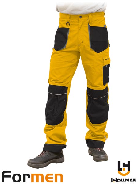 Spodnie ochronne do pasa FORMEN, męskie.- materiał główny: tkanina o splocie canvas 65% poliester, 35% bawełna o gramaturze 270g/m2- wstawki: tkanina 100% poliester Oxford 600D o gramaturze 240 g/m2 oraz elementy z tkaniny Cordura 100% nylon 500D o gramaturze 200 g/m2- zapinane na guzik oraz zamek błyskawiczny- dwie podwójne kieszenie boczne oraz dwie tylne zapinane na rzep- kieszenie na nogawkach, w tym jedna zapinana na rzep z dodatkowymi kieszonkami na akcesoria oraz jedna podłużna z przegródkami- kieszenie na wkładki nakolannikowe wkładane od góry z zapięciem na rzep- wyprofilowane kolana- gumka w pasie w tylnej partii umożliwiająca lepsze dopasowanie- końcówka do przypięcia kluczy- uchwyt na młotek na prawej nogawce- odblaskowe elementy- fason: REGULAR– testowane na zawartość szkodliwych dla zdrowia substancji zgodnie ze standardami OEKO-TEX® Standard 100