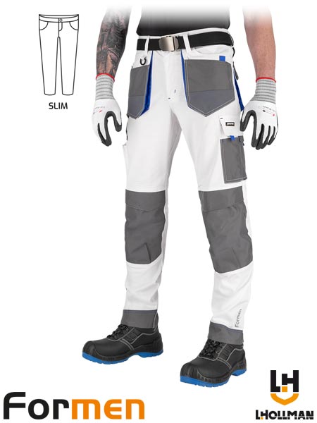 Spodnie ochronne do pasa FORMEN, męskie.- materiał główny: tkanina o splocie twill 62% poliester, 35% bawełna, 3% elastan o gramaturze 250 g/m2- wstawki: tkanina 100% poliester Oxford 600D o gramaturze 270 g/m2 oraz elementy z tkaniny Cordura- zapinane na guzik oraz zamek błyskawiczny- dwie podwójne kieszenie boczne oraz dwie tylne zapinane na rzep- kieszenie na nogawkach, w tym jedna podwójna zapinana na rzep z przegródkami na akcesoria oraz jedna podłużna z przegródkami- kieszenie na wkładki nakolannikowe wkładane od góry z zapięciem na rzep- gumka w pasie umożliwiająca lepsze dopasowanie- końcówka do przypięcia kluczy- uchwyt na młotek na prawej nogawce- odblaskowe elementy- fason: SLIM- testowane na zawartość szkodliwych dla zdrowia substancji zgodnie ze standardami OEKO-TEX® Standard 100
