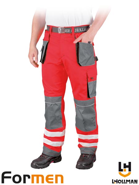 Spodnie ochronne do pasa FORMEN, męskie.- materiał główny tkanina: 80% poliester, 20% bawełna (kolory CSB i CGS: 100% poliester) o gramaturze 270 g/m2- wstawki z kontrastowego materiału 100% poliester OXFORD- dwie kieszenie z tyłu na rzepy oraz dwie boczne podwójne, w tym jedna z kieszonką na telefon- jedna kieszeń na nogawce na rzepy z dodatkowymi kieszonkami na akcesoria oraz jedna boczna podłużna- końcówka do przypięcia kluczy- pętelki umożliwiające doczepienie dodatkowych akcesoriów- gumka w pasie w tylnej partii zwiększa swobodę ruchów oraz umożliwia lepsze dopasowanie- na kolanach kieszenie na wkładki nakolannikowe- dodatkowe wzmocnienia materiałowe na kieszeniach, kolanach oraz na dole nogawek- pasy odblaskowe zapewniające lepszą widoczność- testowane na zawartość szkodliwych dla zdrowia substancji zgodnie ze standardami OEKO-TEX® Standard 100