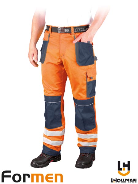Spodnie ochronne do pasa FORMEN, męskie.- materiał główny tkanina: 80% poliester, 20% bawełna (kolory CSB i CGS: 100% poliester) o gramaturze 270 g/m2- wstawki z kontrastowego materiału 100% poliester OXFORD- dwie kieszenie z tyłu na rzepy oraz dwie boczne podwójne, w tym jedna z kieszonką na telefon- jedna kieszeń na nogawce na rzepy z dodatkowymi kieszonkami na akcesoria oraz jedna boczna podłużna- końcówka do przypięcia kluczy- pętelki umożliwiające doczepienie dodatkowych akcesoriów- gumka w pasie w tylnej partii zwiększa swobodę ruchów oraz umożliwia lepsze dopasowanie- na kolanach kieszenie na wkładki nakolannikowe- dodatkowe wzmocnienia materiałowe na kieszeniach, kolanach oraz na dole nogawek- pasy odblaskowe zapewniające lepszą widoczność- testowane na zawartość szkodliwych dla zdrowia substancji zgodnie ze standardami OEKO-TEX® Standard 100
