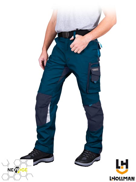 Spodnie ochronne do pasa NEW AGE, męskie.- materiał główny: tkanina o splocie canvas 65% poliester, 35% bawełna o gramaturze 270 g/m2- wstawki: tkanina 100% poliester Oxford 600D o gramaturze 240 g/m2 oraz elementy z tkaniny 100% poliester Oxford 300D o gramaturze 175 g/m2- dodatkowe wstawki na kieszeniach: tkanina 100% nylon Cordura 500D o gramaturze 200 g/m2- zapinane na guzik oraz zamek błyskawiczny- dwie podwójne kieszenie boczne oraz dwie tylne zapinane na rzep- kieszenie na nogawkach, w tym jedna potrójna oraz jedna podwójna podłużna- kieszenie na wkładki nakolannikowe wkładane od góry z zapięciem na rzep- wyprofilowane kolana- gumka w pasie w bocznych partiach umożliwiająca lepsze dopasowanie- dodatkowa szlufka na akcesoria zapinana na rzep- odblaskowe elementy zwiększające widoczność- fason: REGULAR