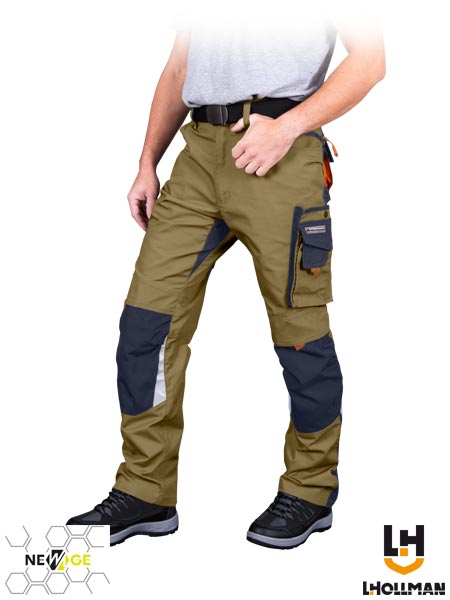Spodnie ochronne do pasa NEW AGE, męskie.- materiał główny: tkanina o splocie canvas 65% poliester, 35% bawełna o gramaturze 270 g/m2- wstawki: tkanina 100% poliester Oxford 600D o gramaturze 240 g/m2 oraz elementy z tkaniny 100% poliester Oxford 300D o gramaturze 175 g/m2- dodatkowe wstawki na kieszeniach: tkanina 100% nylon Cordura 500D o gramaturze 200 g/m2- zapinane na guzik oraz zamek błyskawiczny- dwie podwójne kieszenie boczne oraz dwie tylne zapinane na rzep- kieszenie na nogawkach, w tym jedna potrójna oraz jedna podwójna podłużna- kieszenie na wkładki nakolannikowe wkładane od góry z zapięciem na rzep- wyprofilowane kolana- gumka w pasie w bocznych partiach umożliwiająca lepsze dopasowanie- dodatkowa szlufka na akcesoria zapinana na rzep- odblaskowe elementy zwiększające widoczność- fason: REGULAR