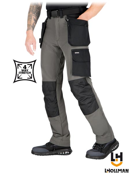 Spodnie ochronne do pasa, męskie.- materiał główny: tkanina z 4-kierunkowego stretchu 90% poliester, 10% elastan o gramaturze 240 g/m2- wstawki na kolanach oraz tylna część kieszeni monterskich: tkanina 100% poliester jacquard Oxfrod 300D o gramaturze 310 g/m2- wstawki w pasie oraz na kieszeniach: tkanina o splocie twill 65% poliester, 35% bawełna o gramaturze 270g/m2- 4-kierunkowy stretch - materiał, który rozciąga się we wszystkich kierunkach- zapinane na guziki, rzep oraz zamek błyskawiczny- silikon w pasie, zapobiegający zsunięciu się- dwie kieszenie boczne, dwie podwójne kieszenie monterskie, w tym jedna z przegródkami oraz dwie tylne- kieszenie na nogawkach, w tym jedna zapinana na rzep oraz jedna podłużna z przegródkami- wyprofilowane kolana- dodatkowa szlufka na akcesoria zapinana na rzep- końcówka do przypięcia kluczy- uchwyt na młotek na prawej nogawce- przeznaczone dla monterów- fason: REGULAR