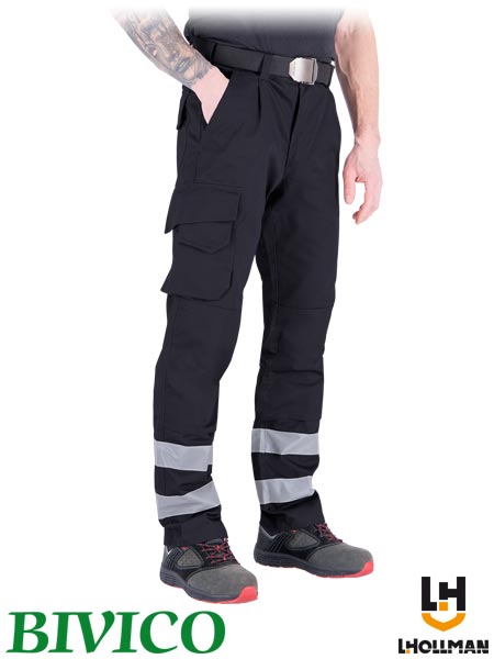 Spodnie ochronne do pasa, męskie.- tkanina o splocie twill: 65% poliester, 35% bawełna- gramatura 270 g/m2- zapinane na guzik oraz zamek błyskawiczny- dwie kieszenie boczne oraz dwie tyle zapinane na napy- trzy kieszenie na nogawkach, w tym jedna podłużna z przegródkami- kieszenie na wkładki nakolannikowe wkładane od dołu- końcówka do przypięcia kluczy- pasy odblaskowe zwiększające widoczność- fason: REGULAR
