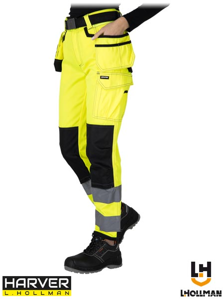 Spodnie ochronne do pasa WESPE, damskie.- materiał główny: tkanina o splocie twill 86% poliester, 14% bawełna o gramaturze 300 g/m2- wstawki: tkanina 80% poliester, 20% bawełna o gramaturze 290 g/m2- wstawki na kolanach: tkanina 100% poliester Oxford o gramaturze 150 g/m2- zapinane na guzik oraz zamek błyskawiczny- dwie kieszenie boczne, dwie odsuwane kieszenie monterskie z przegródkami oraz dwie tylne- kieszenie na nogawkach, w tym jedna zapinana na rzep oraz jedna podwójna podłużna- kieszenie na wkładki nakolannikowe wkładane od dołu z zapięciem na rzep- wyprofilowane kolana- końcówka do przypięcia kluczy- uchwyt na młotek z tyłu na prawej nogawce- tkanina we fluorescencyjnym kolorze i pasy odblaskowe zwiększające widoczność- idealne dla monterek i innych służb porządkowych