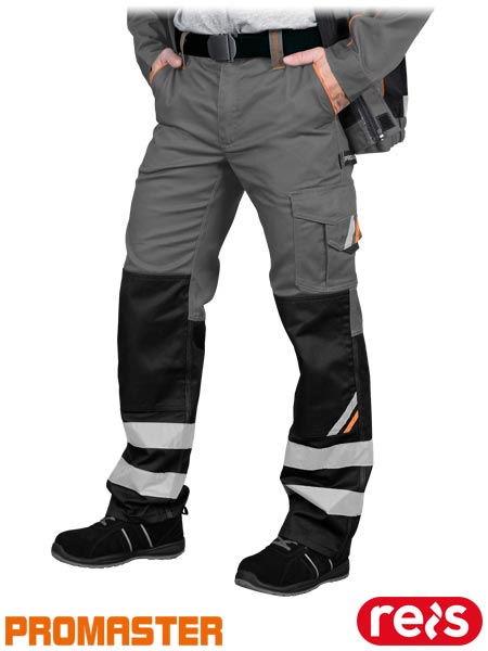 Spodnie ochronne do pasa PROM, męskie.- tkanina: 65% poliester, 35% bawełna o gramaturze 290 g/m2- wstawki z żółtego i pomarańczowego materiału 80% poliester, 20% bawełna- zapinane na guzik oraz zamek błyskawiczny- dwie kieszenie boczne, w tym jedna podwójna oraz dwie tylne zapinane na rzep- dwie kieszenie na nogawkach zapinane na rzep oraz dwie podłużne na narzędzia- kieszenie na wkładki nakolannikowe wkładane od dołu- gumka w pasie w tylnej partii oraz guziki umożliwiające lepsze dopasowanie- końcówka do przypięcia kluczy- pasy odblaskowe zwiększające widoczność- spełnia wymagania normy EN ISO 20471* (dotyczy pasów) oraz EN ISO 13688