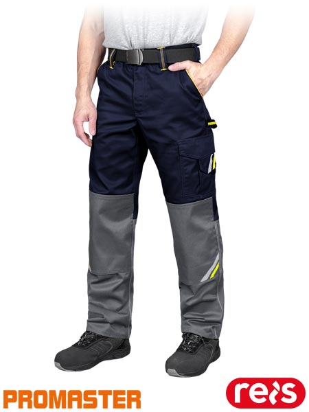Spodnie ochronne do pasa PROX.- 65% poliester, 35% bawełna- gramatura 295-300 g/m2- wstawki z żółtego i pomarańczowego materiału 80% poliester, 20% bawełna- zapinane na guzik i zamek błyskawiczny- dwie kieszenie z tyłu na rzepy oraz dwie boczne- jedna kieszeń na nogawce na rzepy na akcesoria oraz jedna boczna podłużna- gumka w pasie w tylnej partii zwiększa swobodę ruchów oraz umożliwia lepsze dopasowanie- na kolanach kieszenie na wkładki nakolannikowe- końcówka do przypięcia kluczy- wstawki z elemementów odblaskowych- sprawdzona jakość, udoskonalony design
