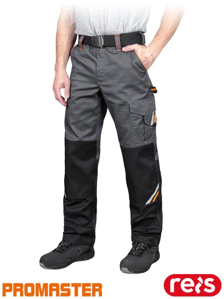 Spodnie ochronne do pasa PROX.- 65% poliester, 35% bawełna- gramatura 295-300 g/m2- wstawki z żółtego i pomarańczowego materiału 80% poliester, 20% bawełna- zapinane na guzik i zamek błyskawiczny- dwie kieszenie z tyłu na rzepy oraz dwie boczne- jedna kieszeń na nogawce na rzepy na akcesoria oraz jedna boczna podłużna- gumka w pasie w tylnej partii zwiększa swobodę ruchów oraz umożliwia lepsze dopasowanie- na kolanach kieszenie na wkładki nakolannikowe- końcówka do przypięcia kluczy- wstawki z elemementów odblaskowych- sprawdzona jakość, udoskonalony design