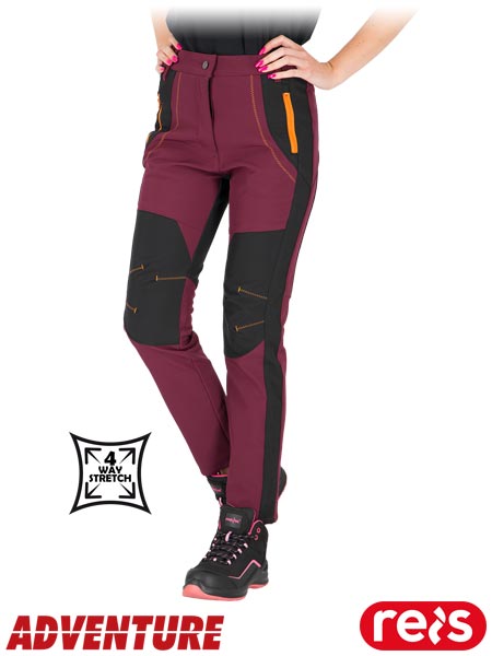 Spodnie ochronne do pasa, damskie.- trójwarstwowa tkanina softshell: 4-kierunkowy stretch 94% poliester, 6% elastan, membrana TPU, polar 100% poliester- gramatura 300-310 g/m2- materiał SOFTSHELL - chroni przed deszczem oraz wiatrem, a jednocześnie pozwala skórze oddychać- 4-kierunkowy stretch - materiał, który rozciąga się we wszystkich kierunkach- zapinane na guzik oraz zamek błyskawiczny- dwie kieszenie boczne oraz jedna tylna zapinane na suwak- wyprofilowane kolana- gumka w pasie w bocznych partiach umożliwiająca lepsze dopasowanie- fason: SLIM