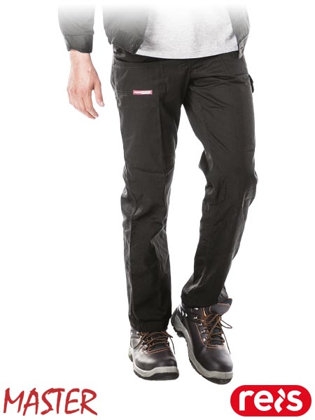 Spodnie ochronne do pasa MASTER, męskie.- tkanina: 65% poliester, 35% bawełna- gramatura 240 g/m2- zapinane na guziki- dwie kieszenie boczne oraz jedna tylna- podłużna kieszeń na nogawce- gumka w pasie w bocznych partiach umożliwiająca lepsze dopasowanie- uchwyt na młotek na lewej nogawce- fason: REGULAR