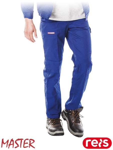Spodnie ochronne do pasa MASTER, męskie.- tkanina: 65% poliester, 35% bawełna- gramatura 240 g/m2- zapinane na guziki- dwie kieszenie boczne oraz jedna tylna- podłużna kieszeń na nogawce- gumka w pasie w bocznych partiach umożliwiająca lepsze dopasowanie- uchwyt na młotek na lewej nogawce- fason: REGULAR