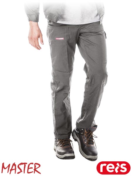 Spodnie ochronne do pasa MASTER, męskie.- tkanina: 65% poliester, 35% bawełna- gramatura 240 g/m2- zapinane na guziki- dwie kieszenie boczne oraz jedna tylna- podłużna kieszeń na nogawce- gumka w pasie w bocznych partiach umożliwiająca lepsze dopasowanie- uchwyt na młotek na lewej nogawce- fason: REGULAR