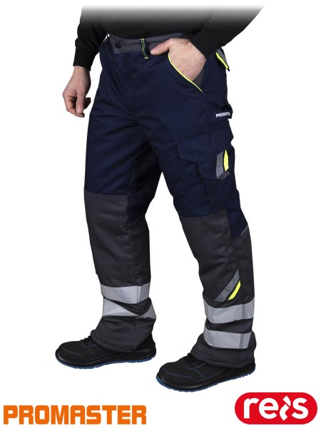 Spodnie ochronne ocieplane, męskie.- tkanina o splocie twill: 65% poliester, 35% bawełna o gramaturze 300 g/m2- wyściółka 100% poliester o gramaturze 180 g/m2- podszewka pikowana 100% poliester tafta 190T o gramaturze 85 g/m2- zapinane na guzik oraz zamek błyskawiczny- trzy kieszenie boczne oraz dwie tylne zapinane na rzep- kieszenie na nogawkach, w tym jedna podwójna zapinana na rzep z przegródkami na akcesoria oraz jedna podwójna podłużna- kieszenie na wkładki nakolannikowe wkładane od dołu- gumka w pasie w tylnej partii umożliwiająca lepsze dopasowanie- końcówka do przypięcia kluczy- uchwyt na młotek na prawej nogawce- pasy odblaskowe zwiększające widoczność- spełniają wymagania normy EN ISO 20471* (dotyczy pasów) oraz EN ISO 13688