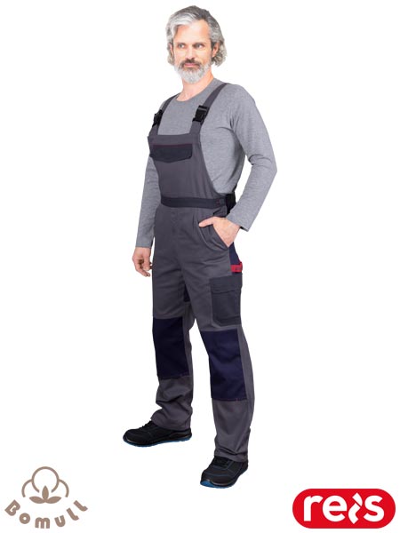 Spodnie ochronne ogrodniczki BOMER.- tkanina: 100% bawełna o gramaturze 260 g/m2- wstawki z granatowego materiału 62% poliester, 34% bawełna, 4% elastan o gramaturze 240 g/m2- kieszeń na klatce piersiowej zapinana na rzep- dwie boczne oraz dwie tylne kieszenie- trzy kieszenie na nogawkach, w tym jedna zapinana na rzep- gumka w pasie w bocznych partiach zwiększa swobodę ruchów oraz umożliwia lepsze dopasowanie- możliwość regulacji w pasie dzięki dodatkowym guzikom oraz długości szelek, które to dodatkowo mają w tylnej partii gumkę- na kolanach kieszenie na wkładki nakolannikowe- uchwyt na młotek na lewej nogawce- dzięki zastosowaniu spandexu spodnie lepiej dopasowują się do sylwetki, jednocześnie nie krępując ruchów- idealne na upalne dni
