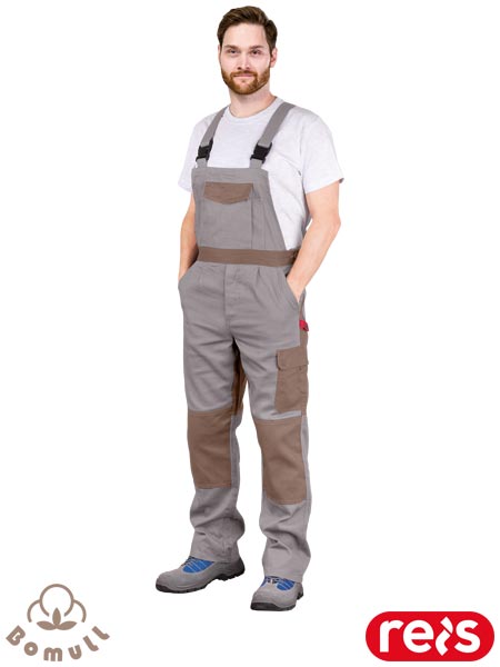 Spodnie ochronne ogrodniczki BOMULL.- tkanina: 100% bawełna- gramatura 260-270 g/m2- ściągacz w pasie oraz guziki umożliwiają regulację co pozwala na lepsze dopasowanie- możliwość regulacji długości za pomocą szelek- sześć kieszeni: dwie boczne, dwie tylne na rzep oraz dwie na nogawkach- dodatkowo trzy kieszenie w górnej partii spodni, w tym jedna na rzep- duża liczba kieszeni zwiększa funkcjonalność spodni- na kolanach kieszenie na wkładki nakolannikowe