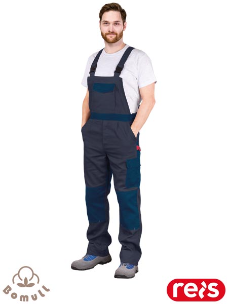 Spodnie ochronne ogrodniczki BOMULL.- tkanina: 100% bawełna- gramatura 260-270 g/m2- ściągacz w pasie oraz guziki umożliwiają regulację co pozwala na lepsze dopasowanie- możliwość regulacji długości za pomocą szelek- sześć kieszeni: dwie boczne, dwie tylne na rzep oraz dwie na nogawkach- dodatkowo trzy kieszenie w górnej partii spodni, w tym jedna na rzep- duża liczba kieszeni zwiększa funkcjonalność spodni- na kolanach kieszenie na wkładki nakolannikowe