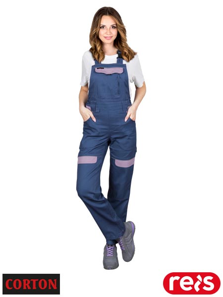 Spodnie ochronne ogrodniczki CORTON, damskie.- tkanina: 100% bawełna- gramatura 260 g/m2- podwójna kieszeń na klatce piersiowej- dwie boczne kieszenie oraz dwie tylne zapinane na rzep- kieszenie na nogawkach, w tym jedna na narzędzia- ściągacz w pasie oraz guziki zwiększają swobodę ruchów oraz umożliwiają lepsze dopasowanie- możliwość regulacji długości za pomocą szelek, które dodatkowo mają w tylnej partii gumkę- odblaskowe elementy