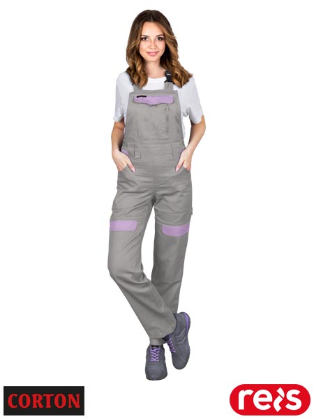 Spodnie ochronne ogrodniczki CORTON, damskie.- tkanina: 100% bawełna- gramatura 260 g/m2- podwójna kieszeń na klatce piersiowej- dwie boczne kieszenie oraz dwie tylne zapinane na rzep- kieszenie na nogawkach, w tym jedna na narzędzia- ściągacz w pasie oraz guziki zwiększają swobodę ruchów oraz umożliwiają lepsze dopasowanie- możliwość regulacji długości za pomocą szelek, które dodatkowo mają w tylnej partii gumkę- odblaskowe elementy