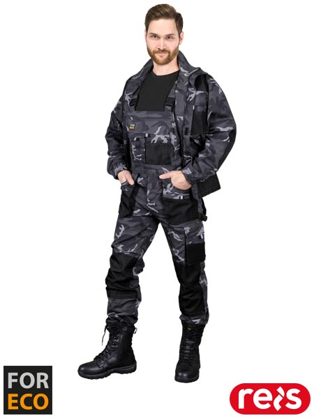 Spodnie ochronne ogrodniczki, męskie.- materiał główny: tkanina 80% poliester, 20% bawełna o gramaturze 260 g/m2- wstawki: tkanina 100% poliester Oxford 600D o gramaturze 200 g/m2- zapinane na zamek błyskawiczny zasłonięty patką- podwójna kieszeń na klatce piersiowej z dodatkowymi przegródkami- dwie podwójne kieszenie boczne z przegródkami oraz dwie tylne zapinane na rzep- dwie podwójne kieszenie na nogawkach, w tym jedna na narzędzia- kieszenie na wkładki nakolannikowe wkładane od dołu, zapinane na rzep- możliwość regulacji długości za pomocą szelek, które dodatkowo mają w tylnej partii gumkę- gumka w pasie w tylnej partii oraz guziki umożliwiające lepsze dopasowanie- końcówka do przypięcia kluczy- uchwyt na młotek na lewej nogawce- odblaskowe elementy zwiększające widoczność- testowane na zawartość szkodliwych dla zdrowia substancji zgodnie ze standardami OEKO-TEX® Standard 100