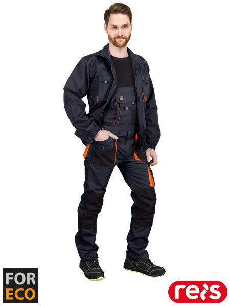 Spodnie ochronne ogrodniczki, męskie.- materiał główny: tkanina 80% poliester, 20% bawełna o gramaturze 260 g/m2- wstawki: tkanina 100% poliester Oxford 600D o gramaturze 200 g/m2- zapinane na zamek błyskawiczny zasłonięty patką- podwójna kieszeń na klatce piersiowej z dodatkowymi przegródkami- dwie podwójne kieszenie boczne z przegródkami oraz dwie tylne zapinane na rzep- dwie podwójne kieszenie na nogawkach, w tym jedna na narzędzia- kieszenie na wkładki nakolannikowe wkładane od dołu, zapinane na rzep- możliwość regulacji długości za pomocą szelek, które dodatkowo mają w tylnej partii gumkę- gumka w pasie w tylnej partii oraz guziki umożliwiające lepsze dopasowanie- końcówka do przypięcia kluczy- uchwyt na młotek na lewej nogawce- odblaskowe elementy zwiększające widoczność- fason: REGULAR- testowane na zawartość szkodliwych dla zdrowia substancji zgodnie ze standardami OEKO-TEX® Standard 100