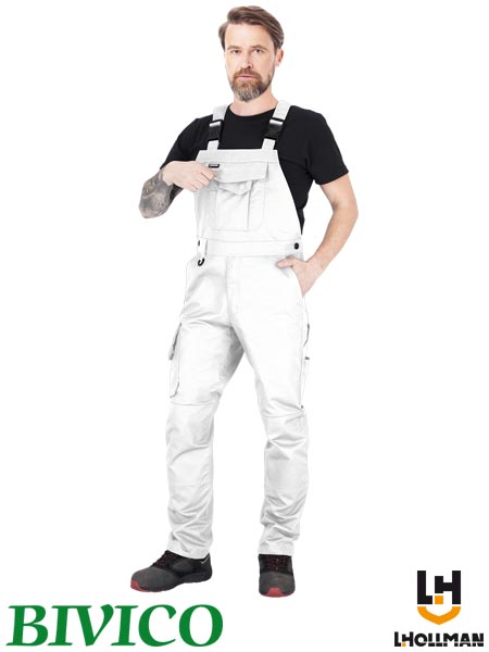 Spodnie ochronne ogrodniczki, męskie.- tkanina: 65% poliester, 35% bawełna- gramatura 270 g/m2- zapinane na zamek błyskawiczny zasłonięty patką- podwójna kieszeń na klatce piersiowej zapinana na napy oraz dodatkowa przegródka- dwie kieszenie boczne oraz dwie tylne zapinane na napy- trzy kieszenie na nogawkach, w tym jedna podłużna z przegródkami- kieszenie na wkładki nakolannikowe wkładane od dołu- możliwość regulacji długości za pomocą szelek, które dodatkowo mają w tylnej partii gumkę- guziki w pasie umożliwiające lepsze dopasowanie- końcówka do przypięcia kluczy- fason: REGULAR