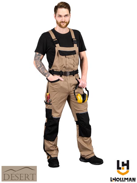 Spodnie ochronne ogrodniczki DESERT.- 97% bawełna, 3% spandex- gramatura 180 g/m2- siateczkowe wstawki wykonane z 80% nylonu i 20% spandexu o gramaturze 170 g/m2- dwie kieszenie na klatce piersiowej zapinane na rzep- dwie boczne kieszenie- dwie tylne kieszenie zapinane na rzep- cztery kieszenie na nogawkach, w tym dwie zapinane na rzep- gumka w pasie w tylnej partii zwiększa swobodę ruchów oraz umożliwia lepsze dopasowanie- możliwość regulacji długości za pomocą szelek, które to dodatkowo mają w tylnej partii gumkę- na kolanach kieszenie na wkładki nakolannikowe- odblaskowe elementy- zastosowanie siateczki wzdłuż nogawek oraz z tyłu na wysokości kolan zapewnia lepszą wentylację- zwiększona wytrzymałość dzięki wstawkom wykonanym z materiału Cordura- uchwyt na młotek na lewej nogawce- idealne na upalne dni