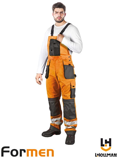 Spodnie ochronne ogrodniczki FORMEN, męskie.- materiał główny tkanina: 80% poliester, 20% bawełna (kolory CSB i CGS: 100% poliester) o gramaturze 270 g/m2- wstawki z kontrastowego materiału 100% poliester Oxford- dwie kieszenie z tyłu oraz dwie boczne podwójne w tym część zapisana na rzepy- jedna kieszeń na nogawce na rzepy z dodatkowymi kieszonkami na akcesoria, jedna boczna podłużna oraz jedna na klatce piersiowej z kieszonkami na telefon oraz przybory- końcówka do przypięcia kluczy- pętelki umożliwiające doczepienie dodatkowych akcesoriów- możliwość regulacji w pasie oraz długości za pomocą szelek- guma w tylnej partii zwiększająca swobodę ruchów- na kolanach kieszenie na wkładki nakolannikowe- dodatkowe wzmocnienia materiałowe na kieszeniach, kolanach oraz na dole nogawek- pasy odblaskowe zapewniające lepszą widoczność- testowane na zawartość szkodliwych dla zdrowia substancji zgodnie ze standardami OEKO-TEX® Standard 100