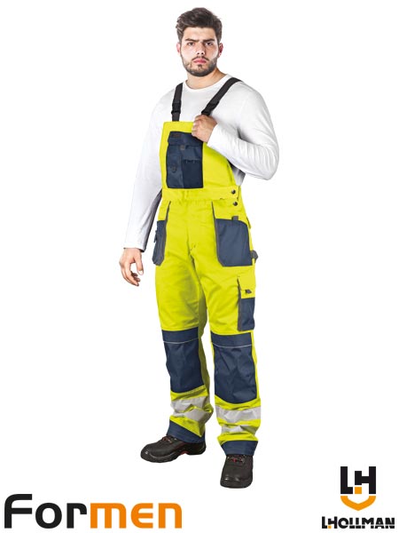 Spodnie ochronne ogrodniczki FORMEN, męskie.- materiał główny tkanina: 80% poliester, 20% bawełna (kolory CSB i CGS: 100% poliester) o gramaturze 270 g/m2- wstawki z kontrastowego materiału 100% poliester OXFORD- dwie kieszenie z tyłu oraz dwie boczne podwójne w tym część zapisana na rzepy- jedna kieszeń na nogawce na rzepy z dodatkowymi kieszonkami na akcesoria, jedna boczna podłużna oraz jedna na klatce piersiowej z kieszonkami na telefon oraz przybory- końcówka do przypięcia kluczy- pętelki umożliwiające doczepienie dodatkowych akcesoriów- możliwość regulacji w pasie oraz długości za pomocą szelek- guma w tylnej partii zwiększająca swobodę ruchów- na kolanach kieszenie na wkładki nakolannikowe- dodatkowe wzmocnienia materiałowe na kieszeniach, kolanach oraz na dole nogawek- pasy odblaskowe zapewniające lepszą widoczność- testowane na zawartość szkodliwych dla zdrowia substancji zgodnie ze standardami OEKO-TEX® Standard 100