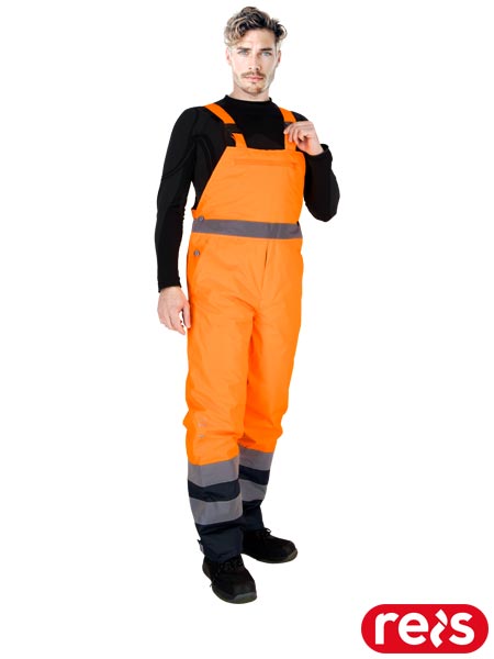 Spodnie ochronne ocieplane ogrodniczki, męskie.- tkanina: 100% poliester Oxford 300D powlekany poliuretanem o gramaturze 190 g/m2- wyściółka 100% poliester o gramaturze 160 g/m2- pikowana podszewka 100% poliester tafeta o gramaturze 55 g/m2- zapinane na zamek błyskawiczny zasłonięty patką- kieszeń na klatce piersiowej zapinana na suwak- dwie kieszenie boczne- możliwość regulacji długości za pomocą szelek, które dodatkowo mają w tylnej partii gumkę- gumka w pasie w tylnej partii oraz guziki umożliwiające lepsze dopasowanie- nogawki zakończone zapięciem na rzep- tkanina we fluorescencyjnym kolorze i pasy odblaskowe zwiększające widoczność- idealne dla drogowców i innych służb porządkowych- fason: REGULAR