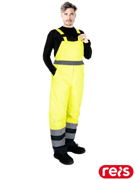 Spodnie ochronne ocieplane ogrodniczki, męskie.- tkanina: 100% poliester Oxford 300D powlekany poliuretanem o gramaturze 190 g/m2- wyściółka 100% poliester o gramaturze 160 g/m2- pikowana podszewka 100% poliester tafeta o gramaturze 55 g/m2- zapinane na zamek błyskawiczny zasłonięty patką- kieszeń na klatce piersiowej zapinana na suwak- dwie kieszenie boczne- możliwość regulacji długości za pomocą szelek, które dodatkowo mają w tylnej partii gumkę- gumka w pasie w tylnej partii oraz guziki umożliwiające lepsze dopasowanie- nogawki zakończone zapięciem na rzep- tkanina we fluorescencyjnym kolorze i pasy odblaskowe zwiększające widoczność- idealne dla drogowców i innych służb porządkowych- fason: REGULAR