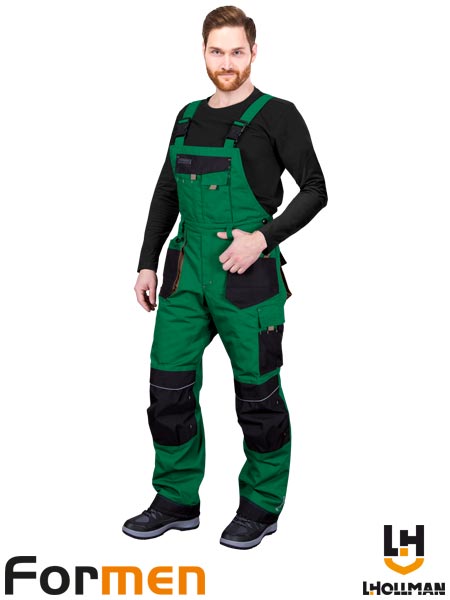 Spodnie ochronne ocieplane ogrodniczki FORMEN.- powłoka 65% poliester, 35% bawełna o gramaturze 270 g/m2- wyściółka 100% poliester o gramaturze 130 g/m2- podszewka 100% poliester typu tafta 190T o gramaturze 50 g/m2- dwie kieszenie z tyłu na rzepy oraz dwie boczne podwójne- jedna kieszeń na nogawce na rzepy z dodatkowymi kieszonkami na akcesoria, jedna boczna podłużna oraz jedna na klatce piersiowej z kieszonkami na telefon oraz przybory- duża liczba kieszeni zwiększa funkcjonalność spodni- końcówka do przypięcia kluczy- pętelki umożliwiające doczepienie dodatkowych akcesoriów- możliwość regulacji w pasie, długości za pomocą szelek oraz szerokości nogawek w dolnej części spodni za pomocą suwaków- guma w tylnej partii zwiększająca swobodę ruchów- na kolanach kieszenie na wkładki nakolannikowe- na kieszeniach, kolanach oraz na dole nogawek dodatkowe wzmocnienie co zwiększa wytrzymałość spodni na przetarcia- staranne wykonanie oraz zwiększona wytrzymałość zapewniają wysoki komfort użytkowania- certyfikat OEKO-TEX® Standard 100 (testy na zawartość szkodliwych dla zdrowia substancji)