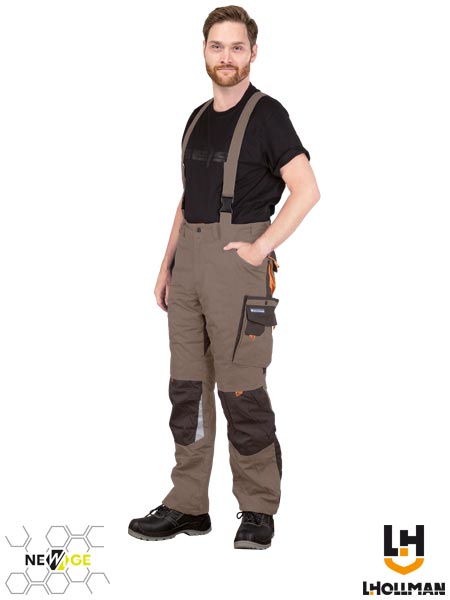 Spodnie ochronne ogrodniczki NEW AGE wykonane z materiału typu canvas.- powłoka 65% poliester, 35% bawełna o gramaturze 270 g/m2- wyściółka 100% poliester o gramaturze 130 g/m2- podszewka 100% poliester typu tafta 210T o gramaturze 50 g/m2- możliwość odsunięcia szelek, dzięki czemu otrzymamy spodnie do pasa- cztery boczne kieszenie, w tym jedna zapinana na suwak- dwie tylne kieszenie zapinane na rzep- kieszenie na nogawkach, w tym na telefon komórkowy- gumy wszyte w pasie dla regulacji tęgości, dzięki czemu spodnie lepiej dopasowują się do sylwetki- na kolanach kieszenie na wkładki nakolannikowe- odblaskowe elementy- zwiększona wytrzymałość dzięki zastosowaniu wstawek z materiału Cordura- nowoczesny design oraz kolorystyka