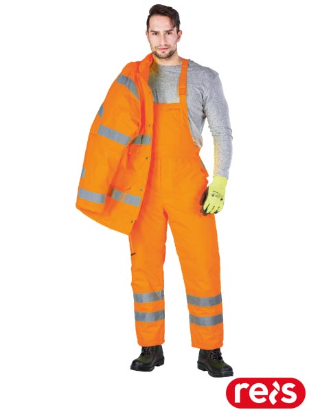 Spodnie ogrodniczki zimowe, z pasami odblaskowymi na dole nogawek.- powłoka 100% poliester Oxford powlekany poliuretanem o gramaturze 180 g/m2- wyściółka 100% poliester o gramaturze 130 g/m2- podszewka 100% poliester typu tafta 190T- możliwość regulacji w długości szelkami- dwie boczne kieszenie- dodatkowa kieszeń w górnej partii spodni- idealne dla drogowców- spełnia wymogi normy EN ISO 20471 (klasa 1)