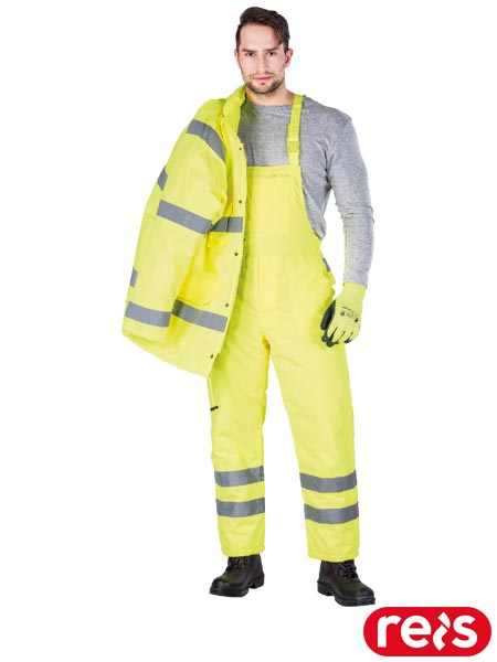 Spodnie ogrodniczki zimowe, z pasami odblaskowymi na dole nogawek.- powłoka 100% poliester Oxford powlekany poliuretanem o gramaturze 180 g/m2- wyściółka 100% poliester o gramaturze 130 g/m2- podszewka 100% poliester typu tafta 190T- możliwość regulacji w długości szelkami- dwie boczne kieszenie- dodatkowa kieszeń w górnej partii spodni- idealne dla drogowców- spełnia wymogi normy EN ISO 20471 (klasa 1)