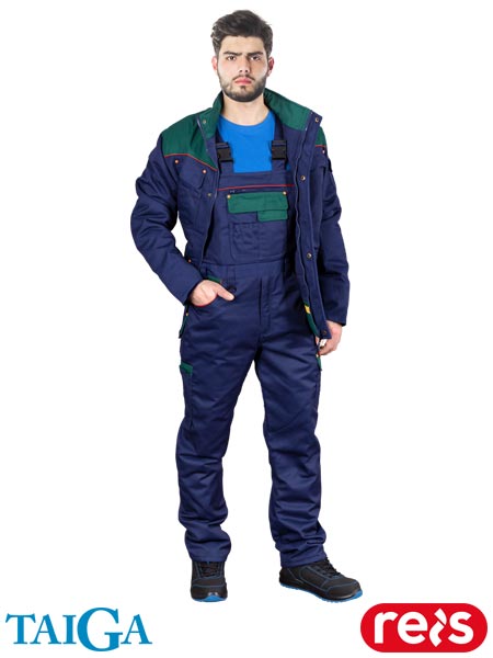Spodnie ochronne ocieplane ogrodniczki TAIGA, tkane.- powłoka 65% poliester, 35% bawełna o gramaturze 290 g/m2- wyściółka 100% poliester o gramaturze 150 g/m2- podszewka 100% poliester o gramaturze 60 g/m2- możliwość regulacji w pasie dzięki napom oraz w długości szelkami, które mają w tylnej partii dodatkowo gumkę- dziewięć kieszeni: dwie boczne, na nogawce jedna duża na napę i trzy małe, z tyłu dwie w tym jedna na napę oraz jedna na telefon komórkowy- dodatkowo dwie kieszenie w górnej partii spodni, w tym jedna na suwak