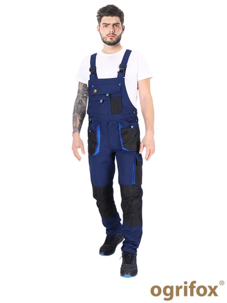Spodnie ochronne ogrodniczki OGR, męskie.- materiał główny: tkanina o splocie canvas 80% poliester, 20% bawełna o gramaturze 260 g/m2- wstawki: tkanina 100% poliester Oxford 600D o gramaturze 200 g/m2- zapinane na zamek błyskawiczny zasłonięty patką- podwójna kieszeń na klatce piersiowej zapinana na rzepy z dodatkowymi przegródkami- dwie podwójne kieszenie boczne z przegródkami oraz dwie tylne zapinane na rzep- dwie kieszenie na nogawkach, w tym jedna na narzędzia- kieszenie na wkładki nakolannikowe wkładane od dołu- możliwość regulacji długości za pomocą szelek, które dodatkowo mają w tylnej partii gumkę- gumka w pasie w tylnej partii oraz guziki umożliwiające lepsze dopasowanie- końcówka do przypięcia kluczy- uchwyt na młotek na lewej nogawce- fason: REGULAR