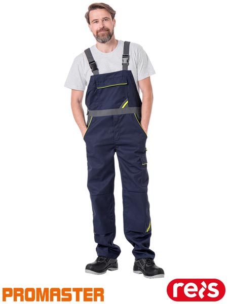 Spodnie ochronne ogrodniczki, męskie.- tkanina: 65% poliester, 35% bawełna- gramatura 300 g/m2- kieszeń na klatce piersiowej zapinana na rzep- dwie kieszenie po bokach- dwie kieszenie z tyłu zapinane na rzep- cztery kieszenie na nogawkach, w tym dwie zapinane na rzep- gumka w pasie w tylnej partii zwiększa swobodę ruchów oraz umożliwia lepsze dopasowanie- możliwość regulacji w pasie dzięki guzikom oraz długości za pomocą szelek- na kolanach kieszenie na wkładki nakolannikowe- końcówka do przypięcia kluczy