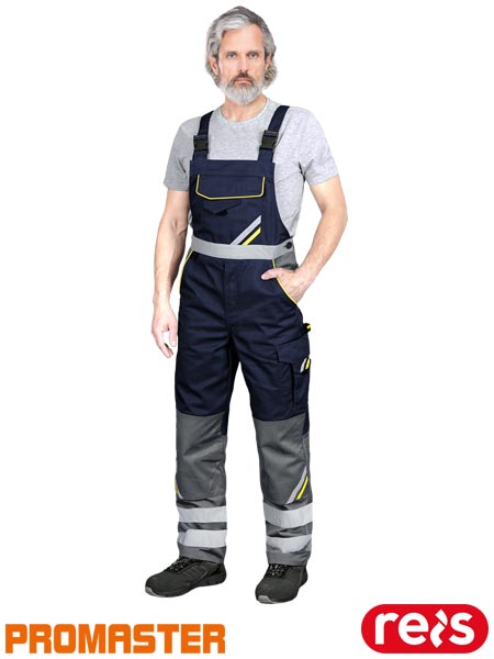 Spodnie ochronne ogrodniczki PROM, męskie.- tkanina: 65% poliester, 35% bawełna o gramaturze 290 g/m2- wstawki z żółtego i pomarańczowego materiału 80% poliester, 20% bawełna- zapinane na zamek błyskawiczny zasłonięty patką- podwójna kieszeń na klatce piersiowej zapinana na rzep- dwie kieszenie boczne, w tym jedna podwójna oraz dwie tylne zapinane na rzep- dwie kieszenie na nogawkach zapinane na rzep oraz dwie podłużne na narzędzia- kieszenie na wkładki nakolannikowe wkładane od dołu- możliwość regulacji długości za pomocą szelek, które dodatkowo mają w tylnej partii gumkę- gumka w pasie w tylnej partii oraz guziki umożliwiające lepsze dopasowanie- końcówka do przypięcia kluczy- pasy odblaskowe zwiększające widoczność- spełnia wymagania normy EN ISO 20471* (dotyczy pasów) oraz EN ISO 13688