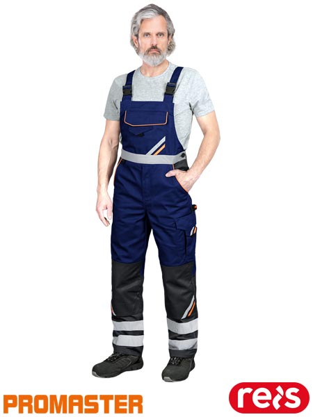 Spodnie ochronne ogrodniczki PROM, męskie.- tkanina: 65% poliester, 35% bawełna o gramaturze 290 g/m2- wstawki z żółtego i pomarańczowego materiału 80% poliester, 20% bawełna- zapinane na zamek błyskawiczny zasłonięty patką- podwójna kieszeń na klatce piersiowej zapinana na rzep- dwie kieszenie boczne, w tym jedna podwójna oraz dwie tylne zapinane na rzep- dwie kieszenie na nogawkach zapinane na rzep oraz dwie podłużne na narzędzia- kieszenie na wkładki nakolannikowe wkładane od dołu- możliwość regulacji długości za pomocą szelek, które dodatkowo mają w tylnej partii gumkę- gumka w pasie w tylnej partii oraz guziki umożliwiające lepsze dopasowanie- końcówka do przypięcia kluczy- pasy odblaskowe zwiększające widoczność- spełnia wymagania normy EN ISO 20471* (dotyczy pasów) oraz EN ISO 13688